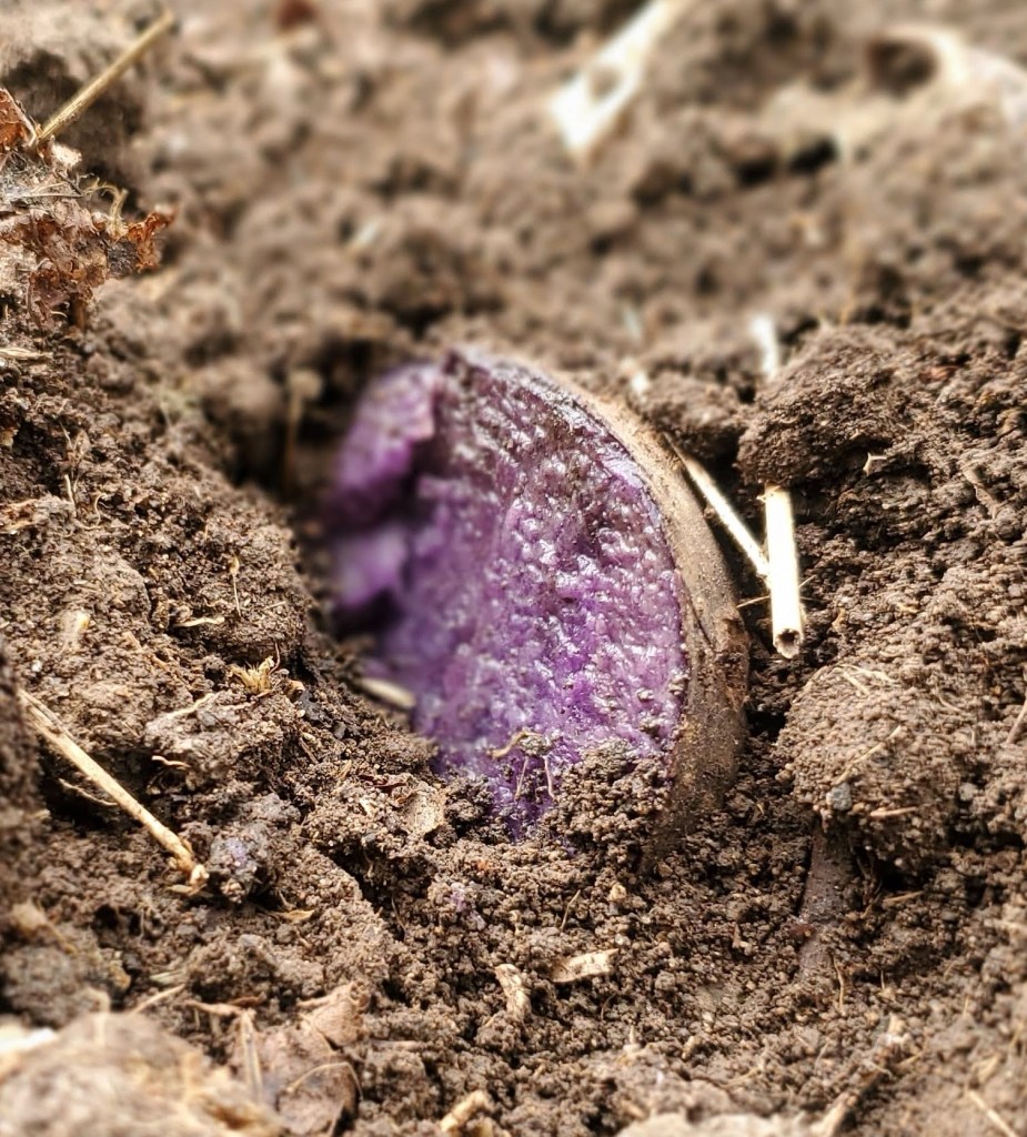 The purple color does make them more challenging to see in the dirt, however. Unless you do cut them open with a hoe. Then it’s obvious, as though you’ve unearthed an alien species of tree with purple tap roots, or a tremors worm ready for a glow party. The craziest part was that each time I unearthed one of these purple potatoes, my heart beat faster. Thoughts of staying clean left me. I got down on my hands and knees and dug around with ungloved fingers for more. See, there’s never just one potato under a plant. They grow on the roots, like tuberous tumors, that store nutrients, so there are always several. Sometimes, more than several, depending on how many years you couldn’t find them to dig them up. I think that is why I got so many this year. Dirt sliding through my fingers, mud pushing under my nails. But there – another one. And was that another? My breath came faster. I was hunting. I wondered if native people or early farmers felt this same rush of discovery. Why did we ever let this go?