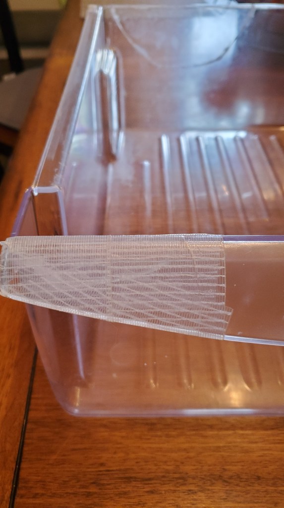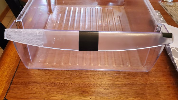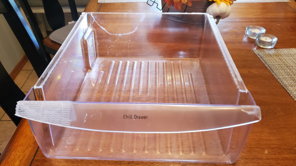 I looked online for a replacement door bin and drawer, but there was nothing. Apparently, the fridge was discontinued. (I guess I know why they were selling the floor model). I used “Clear” duct tape and super glue. Hardly the magazine-ready look.