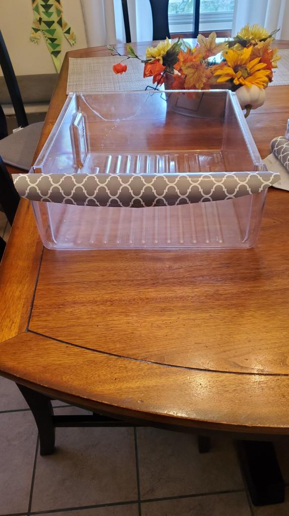 I took my fashionable Chiller Drawer to the fridge and slid it into place. Something was off. The drawer stood out, and not in a good way. I looked at it, thought about it, and looked somemore. Then I happened upon an easy solution. Each of my refrigerator shelves has a white plastic frame that holds the glass. I covered that white area with the contact paper. It is just the front part, so it went super fast. I also covered the handles of the other two drawers, just to make it consistent. When things match, or a pattern repeats, I think it looks more professional and complete.