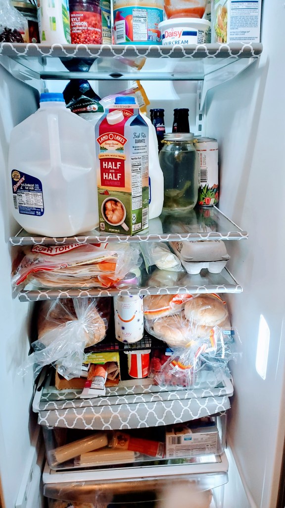 - Consider adding to the other drawers or shelves. I didn’t think just one drawer beautified worked. I would recommend doing all the drawers, and even shelves (partial or full). It provides are more cohesive look. Tip: The contact paper does not stick well to cold plastic. For best results, remove the drawers/shelves before applying. Or, just keeping pressing it down like I do. ๐
